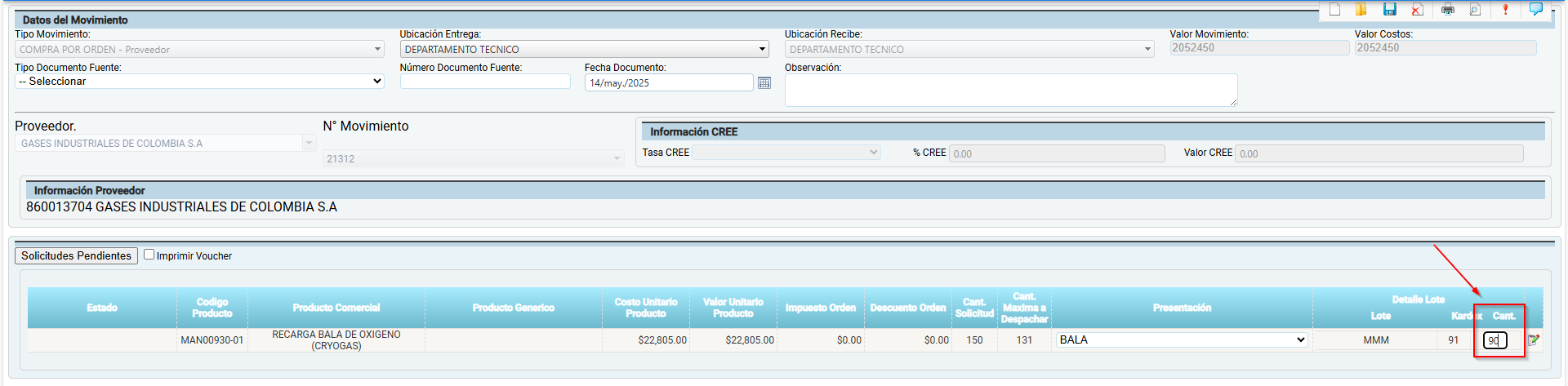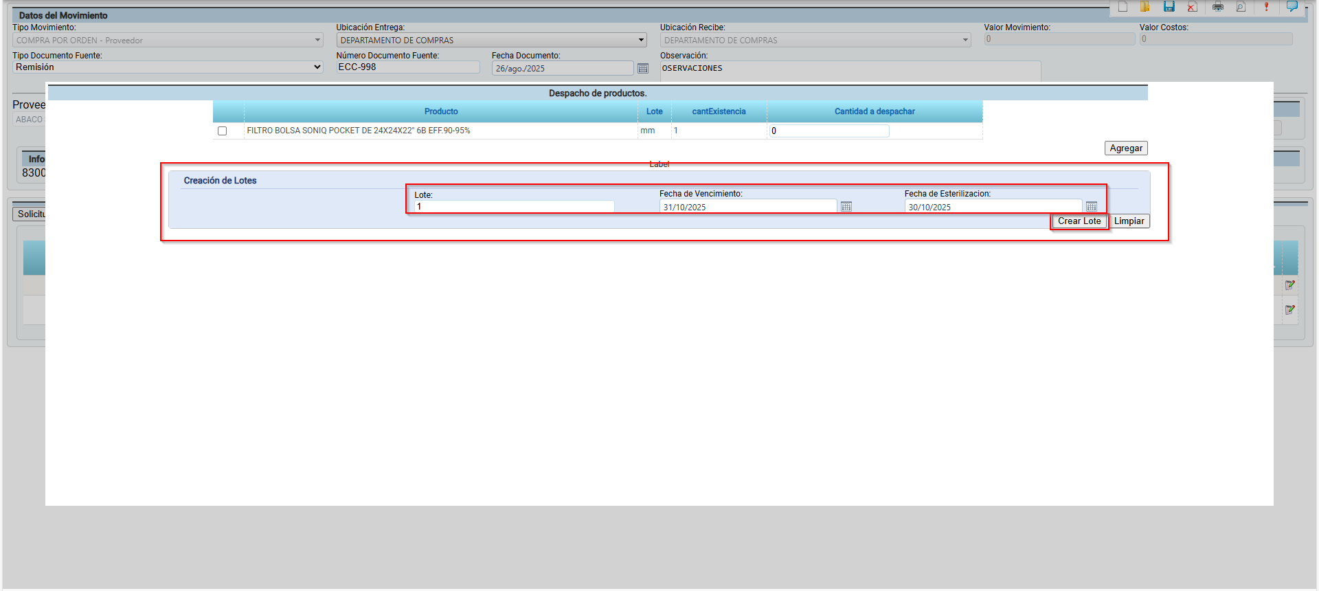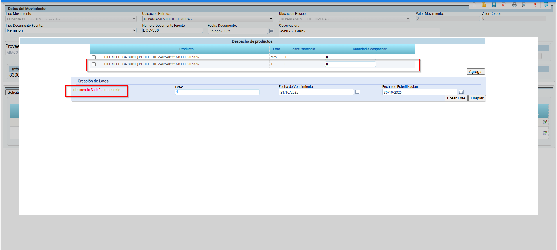 Posteriormente, se debe ingresar la cantidad a despachar en el campo correspondiente al lote seleccionado.