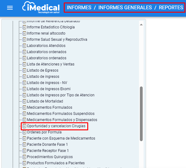 Ruta: informes /Informes generales/Reportes- Historia clínica- oportunidad y cancelación cirugías