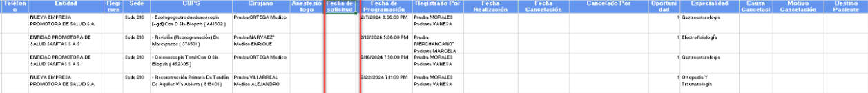 Podemos visualizar que en la tabla se encuentra un nuevo campo llamado “fecha de solicitud” que está ubicado entre la columna de "Anestesiólogo" y "Fecha de Programación"
