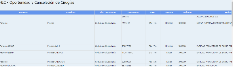 Se desplegará una tabla, cada columna contiene información relevante del paciente: