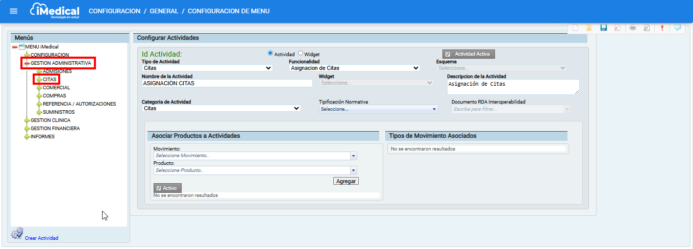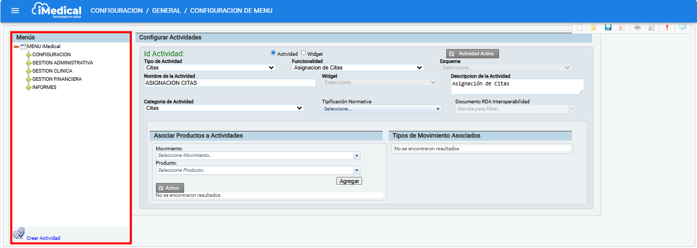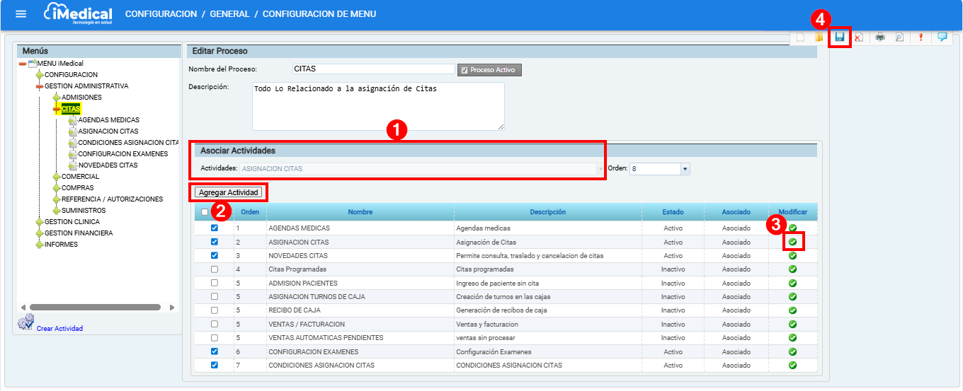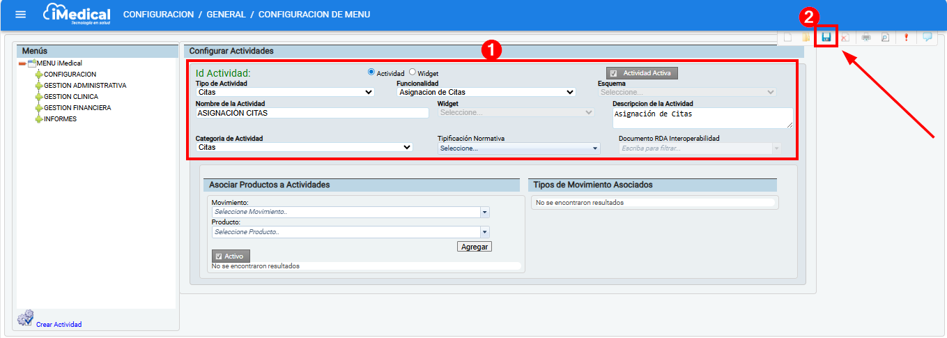 Posteriormente asocie la actividad a la opción correspondiente dentro del menú y una vez asociada la actividad, de clic en icono "Guardar"