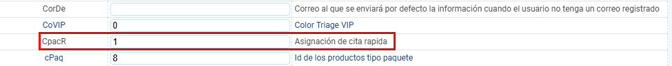 Dentro de esta pestaña, vamos a buscar la variable "CpacR" y procedemos a escribir 1 Para activarla. Con esto ya se será posible la Creación Rápida de Paciente