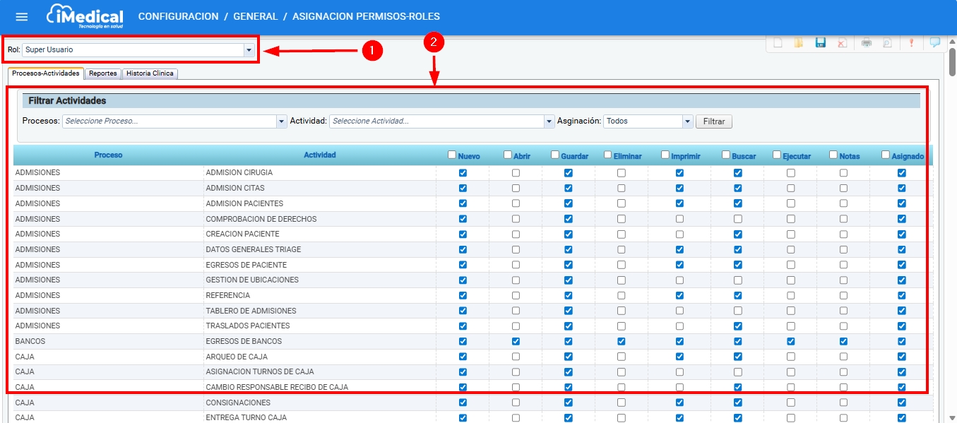 En el campo "Rol", se debe seleccionar a la persona que se le van a conceder los permisos de acuerdo con las necesidades de cada entidad, para efectos de este ejercicio, se selecciona el rol Super Usuario. Al seleccionarlo y la pantalla cargará y aparecerán todas las actividades que el usuario seleccionado tiene permios.
