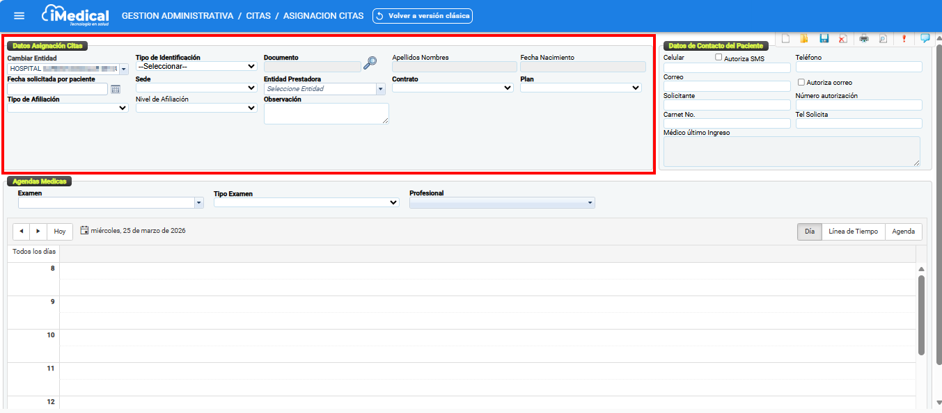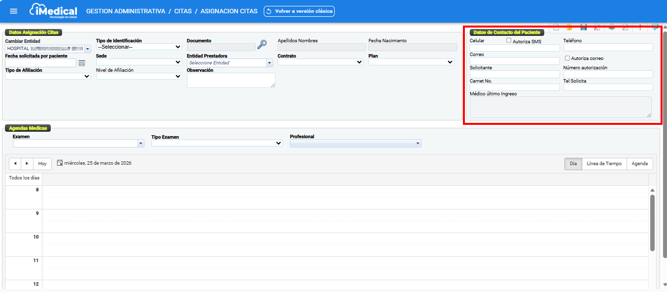 Posteriormente, se deben completar los datos en la sección Datos de Contacto del Paciente, asegurando que la información registrada sea correcta y esté actualizada. Una vez diligenciada esta información, se podrá proceder con la programación de la cita en la sección de la Agenda Médica.