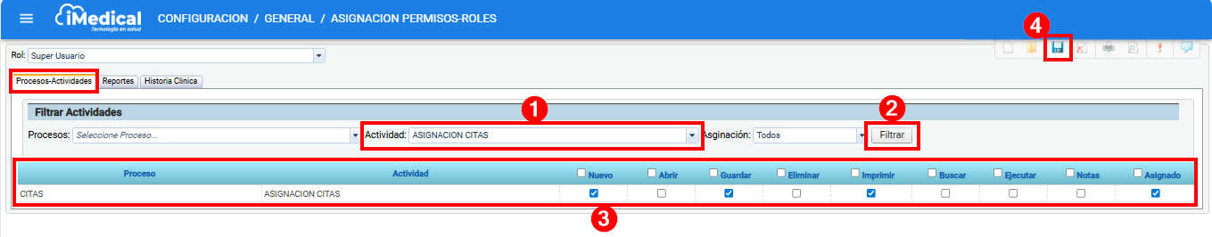 Luego en la pestaña "Procesos-Actividades", Sección "Filtrar Actividades", Campo "Actividad", se debe seleccionar la actividad "Asignación Citas" y dar clic en el botón "Filtrar" Posteriormente asigne los permisos y finalmente, de clic en el ícono "Guardar".