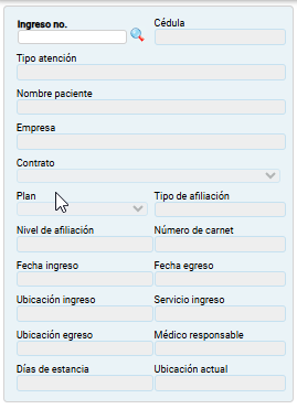 - Ingreso no.: Campo donde se ingresa el número de ingreso del paciente. Tiene un ícono de lupa que permite buscar el número de ingreso en el sistema.