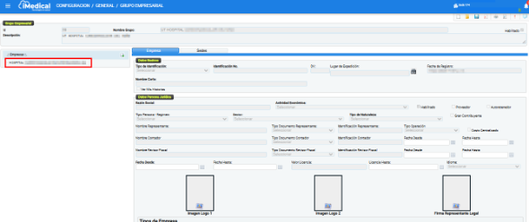 En esta pantalla, nos dirigimos a la parte superior izquierda, en la sección "Empresas" y debemos dar clic sobre el nombre de la empresa que está registrada en el sistema. En este caso es Hospital