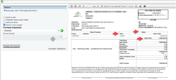 Cuando la variable está activa, la impresión del tipo de factura cápita no muestra la palabra 'Cápita.' Solo se visualizan los campos: Valor, Datos y Subtotal. Asimismo, se ocultan los campos de Población y Número de Días.