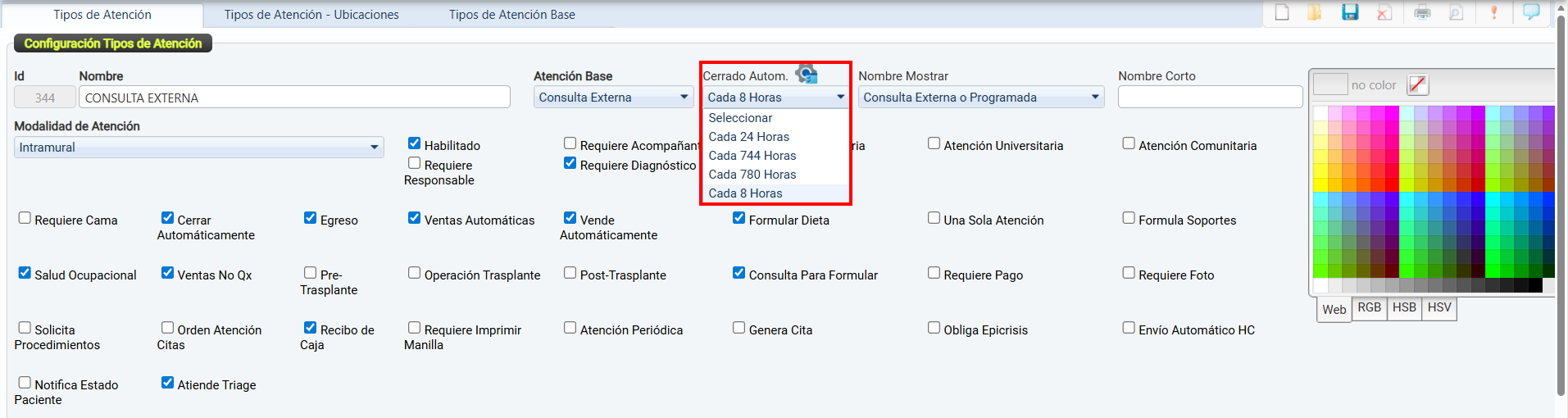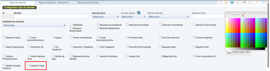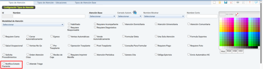 El color seleccionado se mostrará asociado al tipo de atención en las pantallas del sistema, permitiendo una rápida identificación del servicio.
