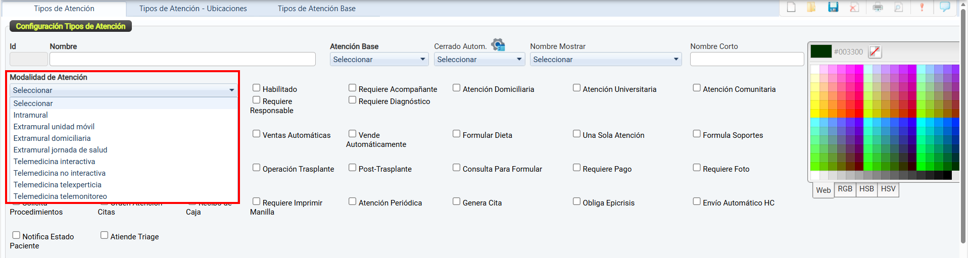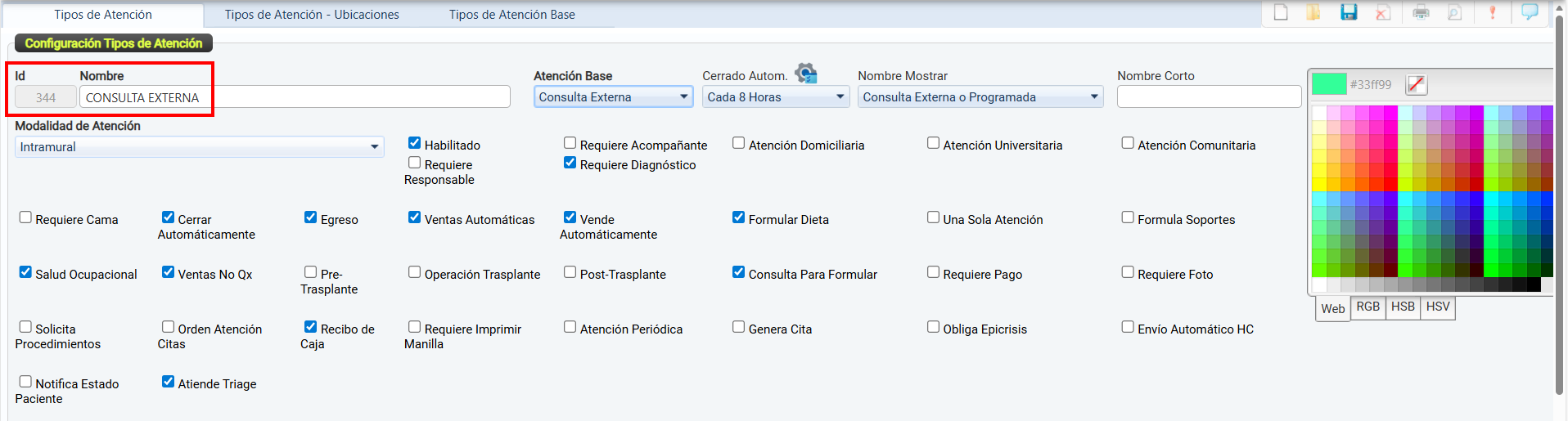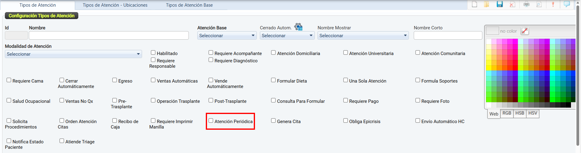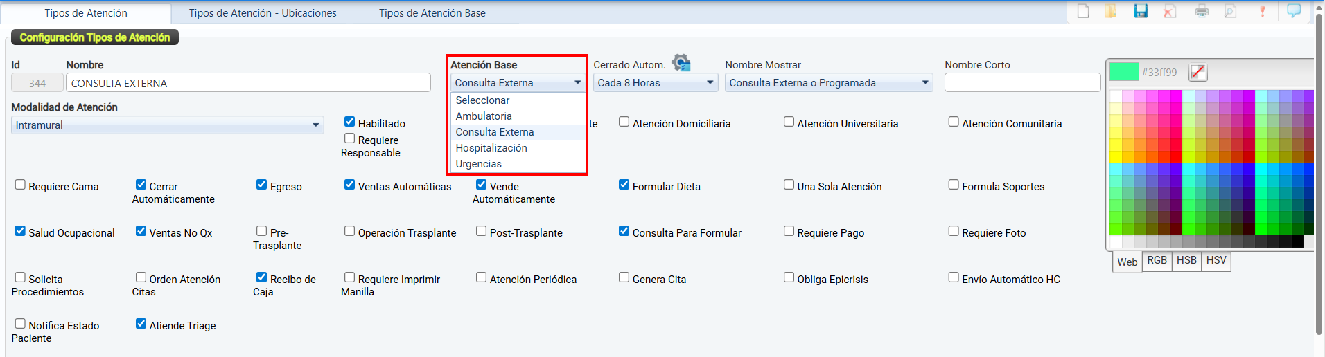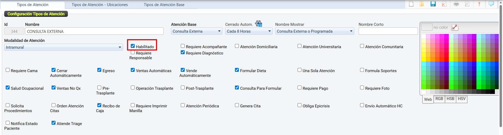 La casilla de verificación Habilitado permite activar o desactivar el uso de un tipo de atención dentro del sistema.