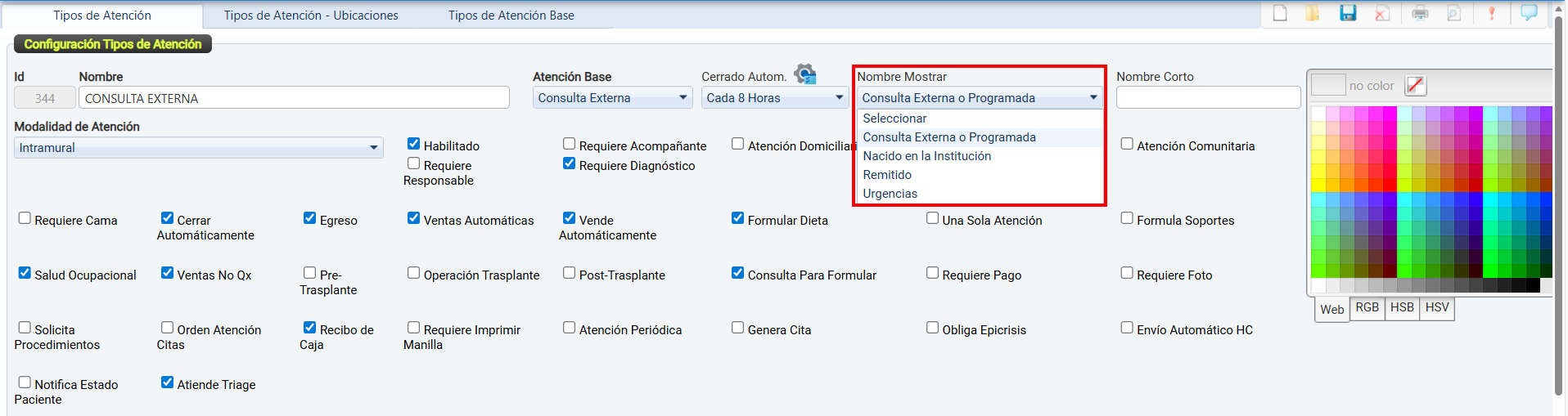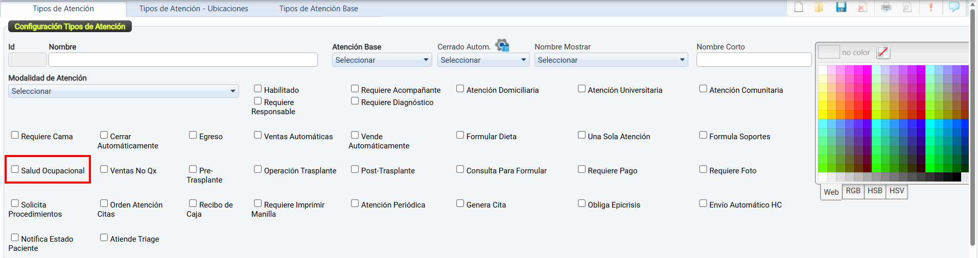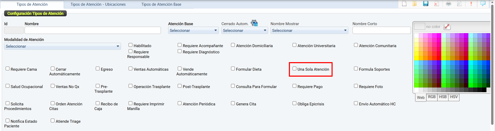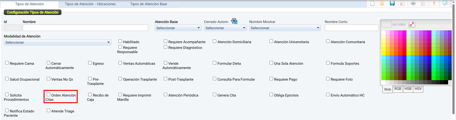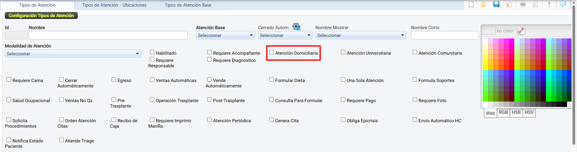 La casilla de verificación Habilitado permite activar o desactivar el uso de un tipo de atención dentro del sistema.