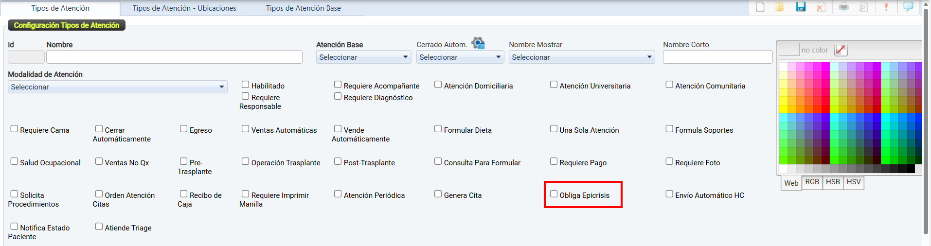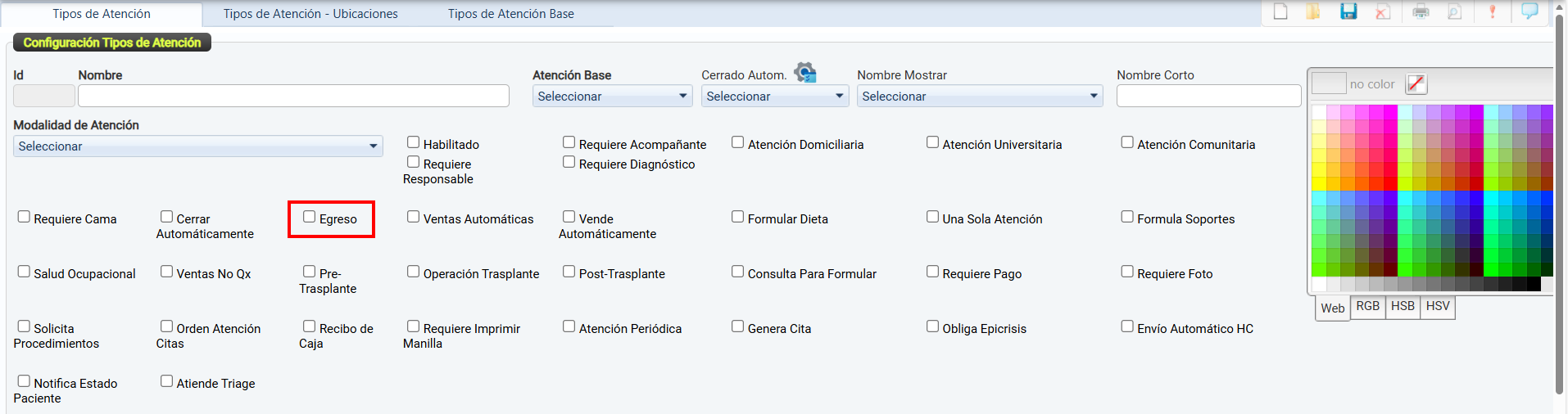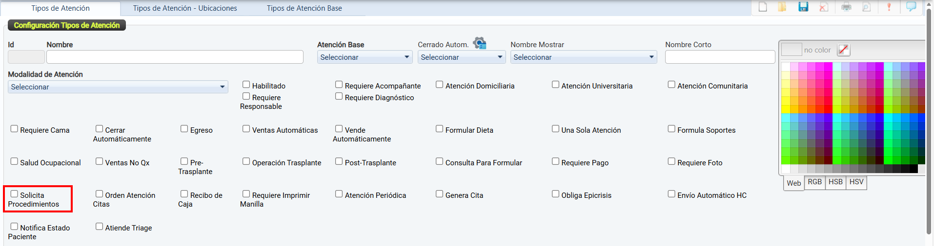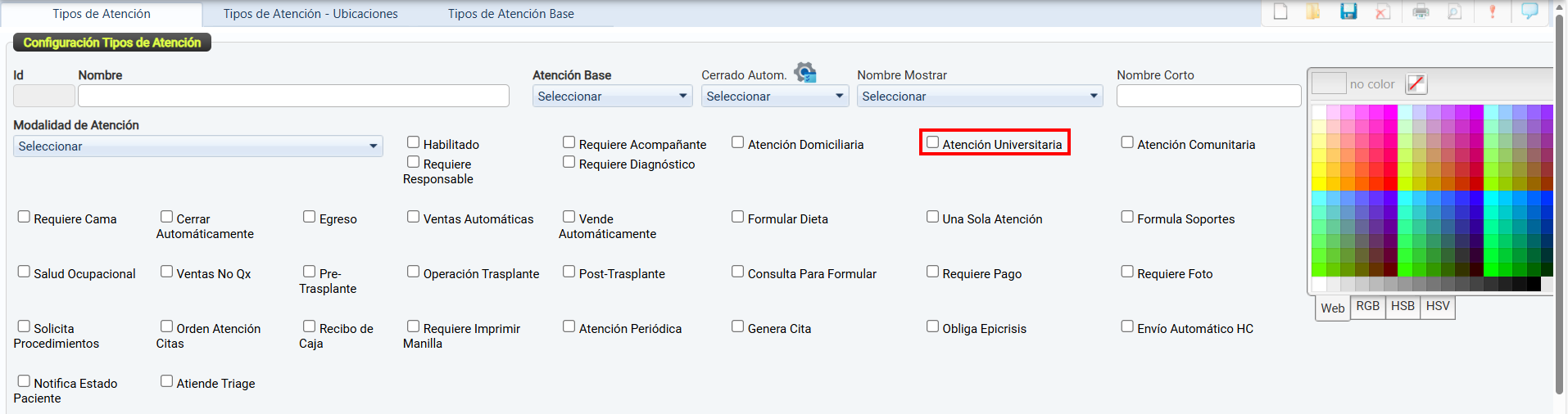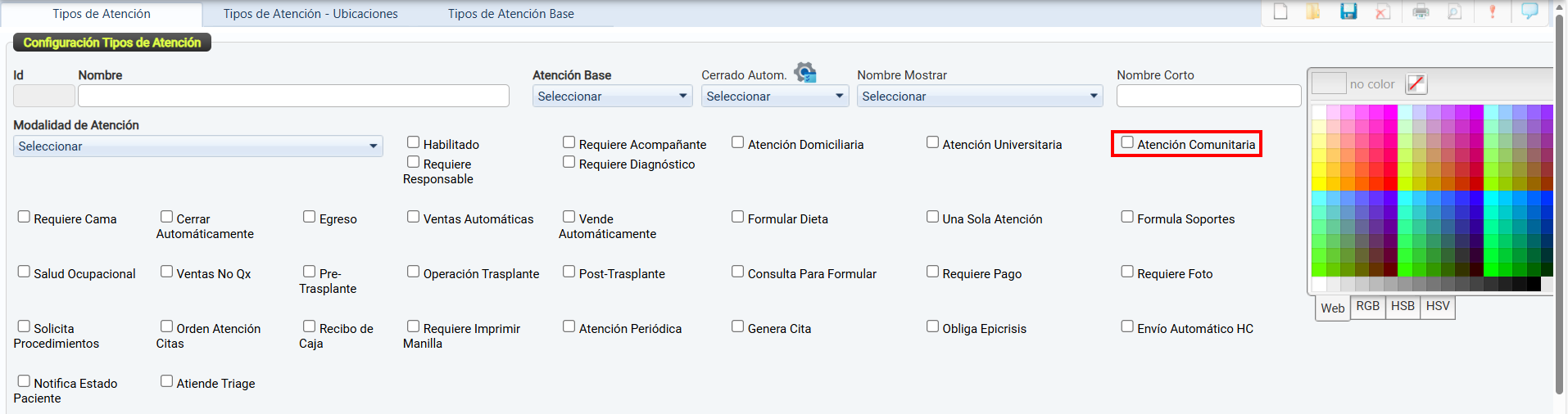 La casilla de verificación Habilitado permite activar o desactivar el uso de un tipo de atención dentro del sistema.