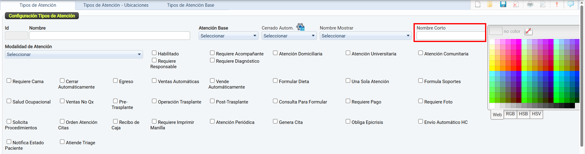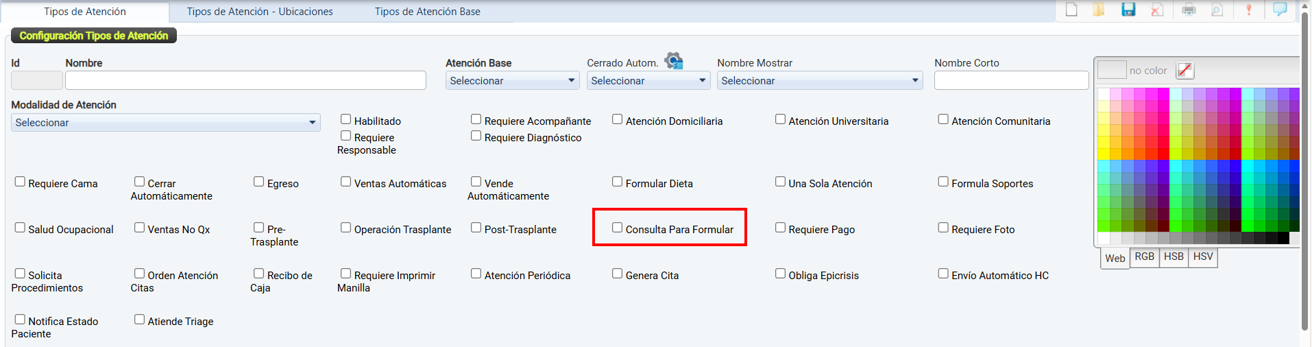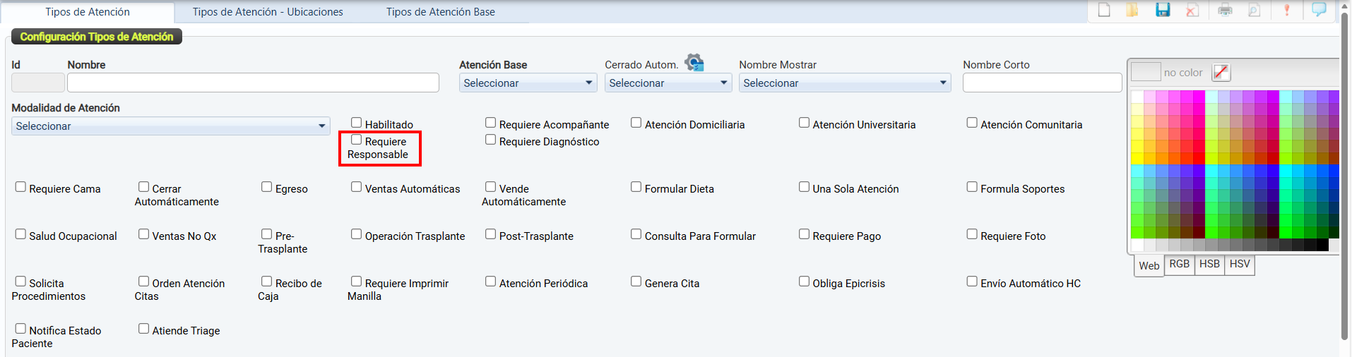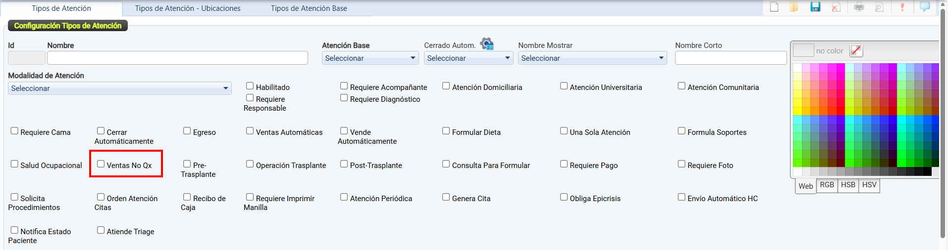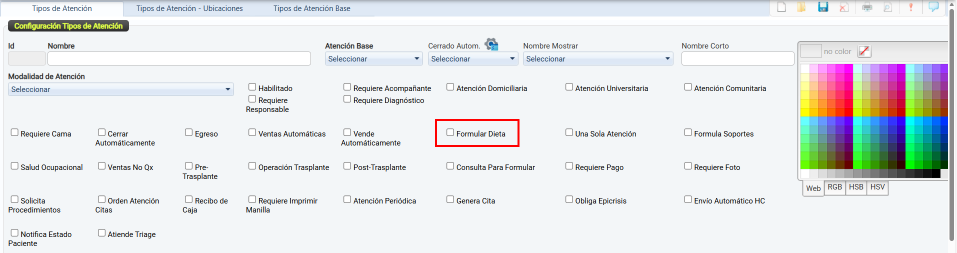 La casilla de verificación Habilitado permite activar o desactivar el uso de un tipo de atención dentro del sistema.