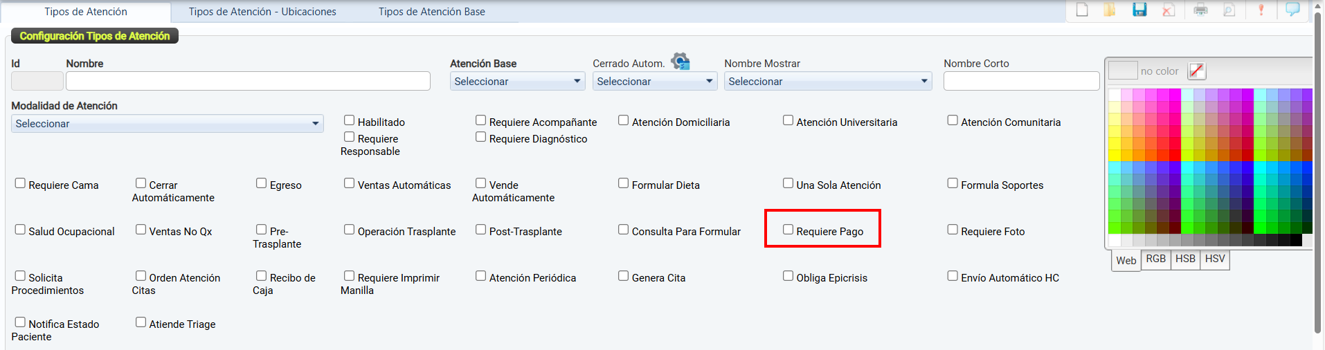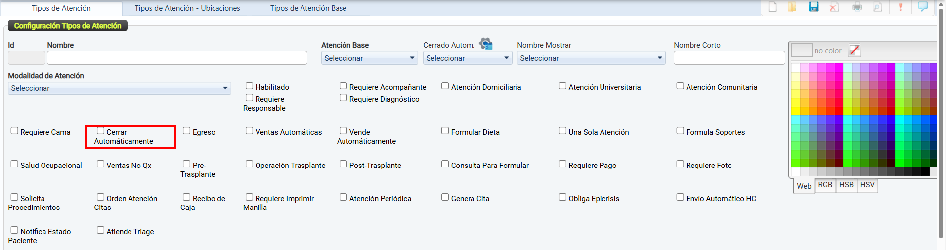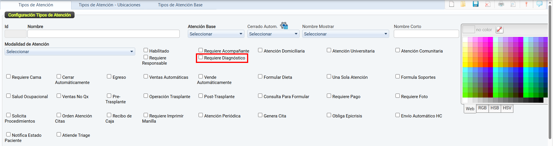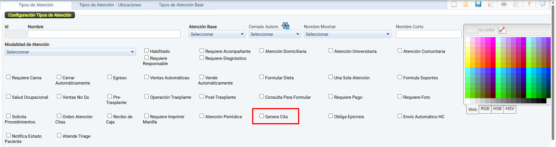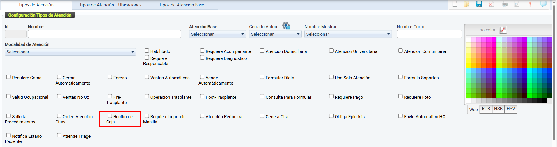 La casilla de verificación Habilitado permite activar o desactivar el uso de un tipo de atención dentro del sistema.