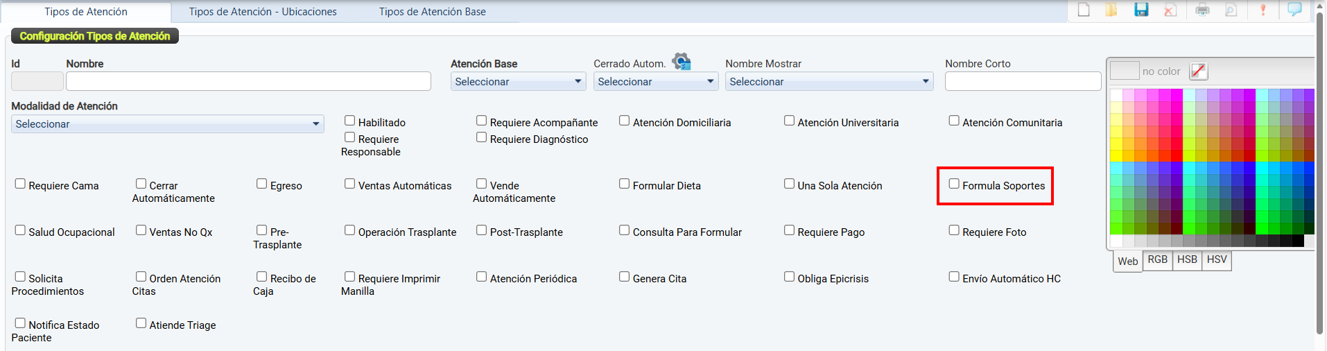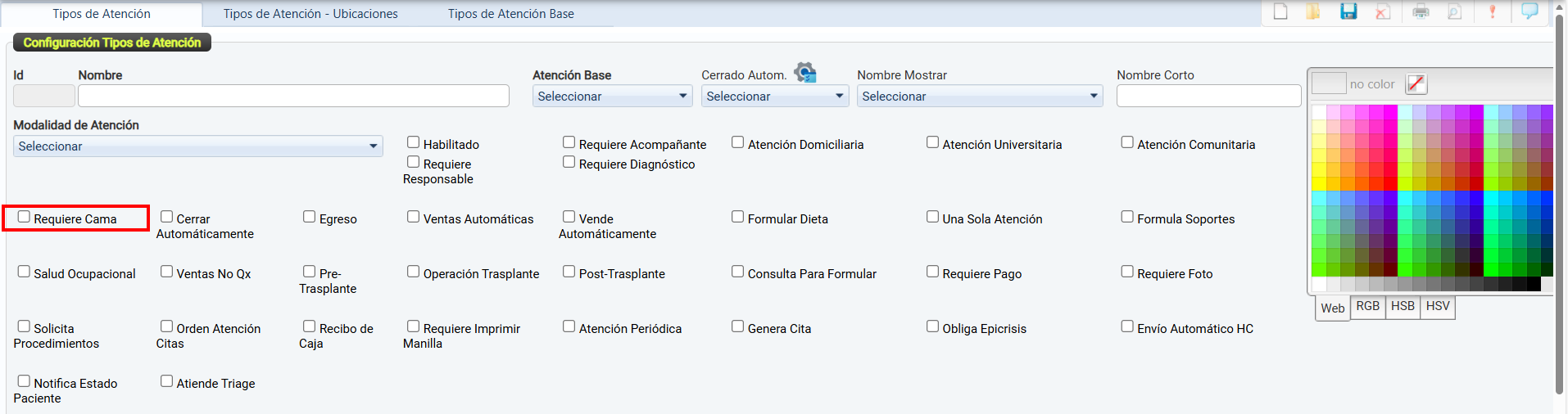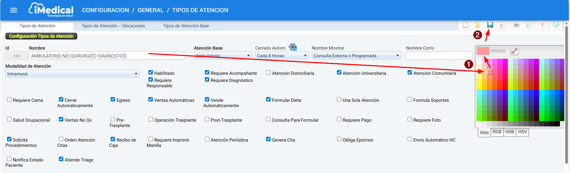 Una vez configuradas, estas se podrán seleccionar y vincular desde el módulo Tipos de Atención por Ubicaciones.