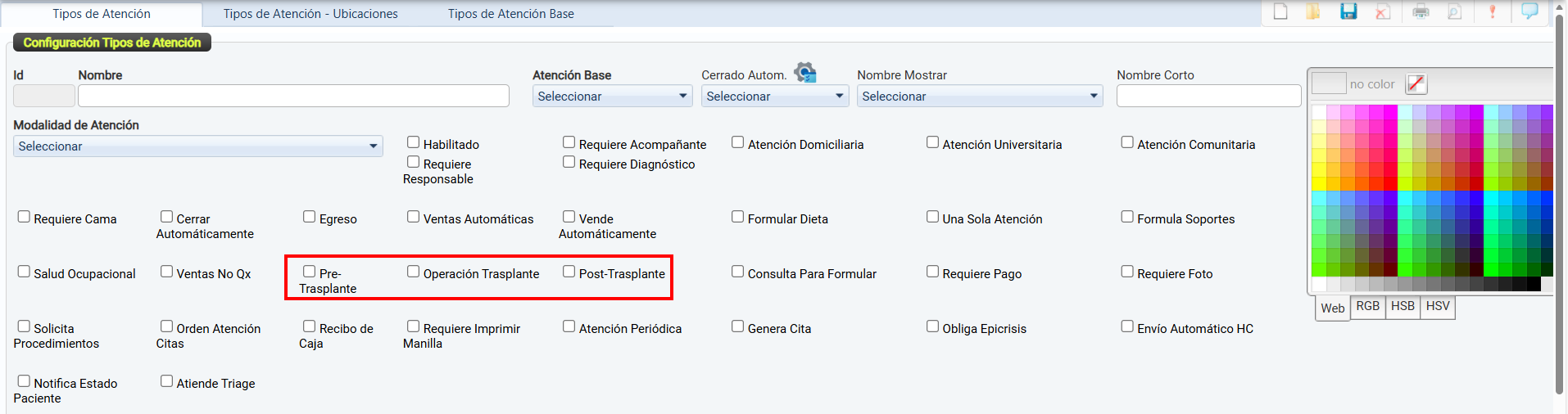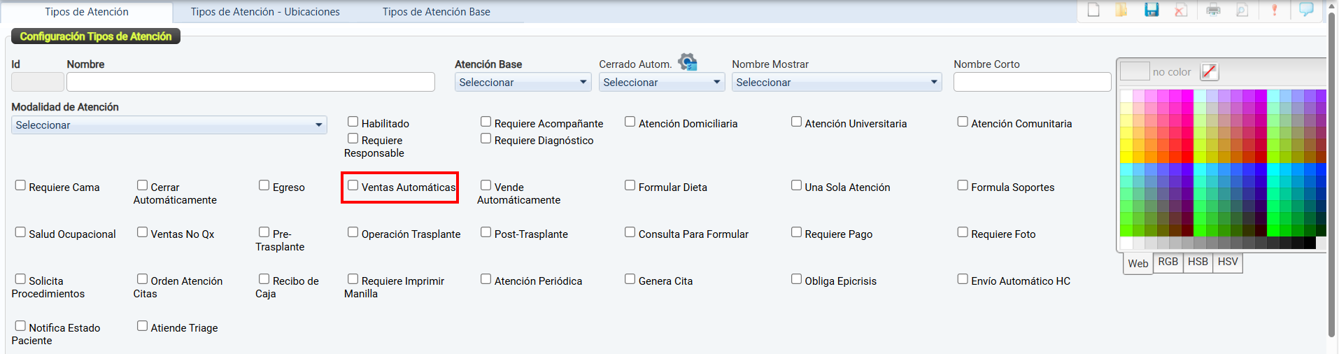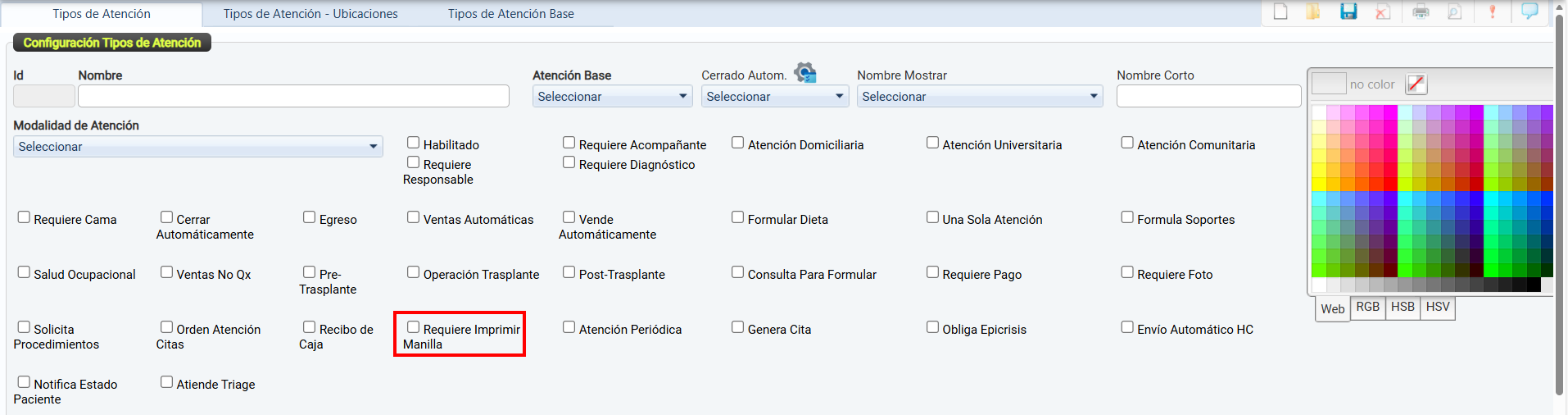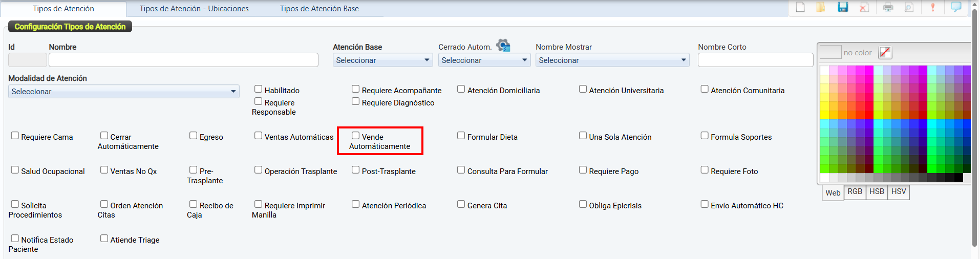 Una vez configuradas, estas se podrán seleccionar y vincular desde el módulo Tipos de Atención por Ubicaciones.