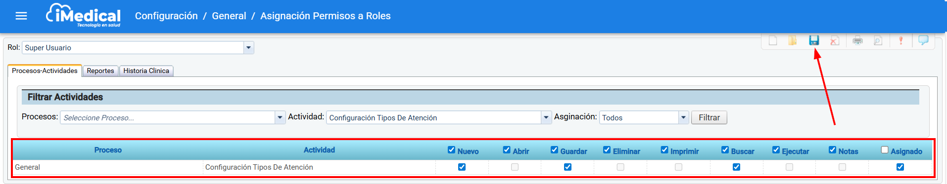 Una vez ubicada la actividad "Configuración tipos de atención". verifique que tenga los permisos activados por medio de las casillas de verificación.
