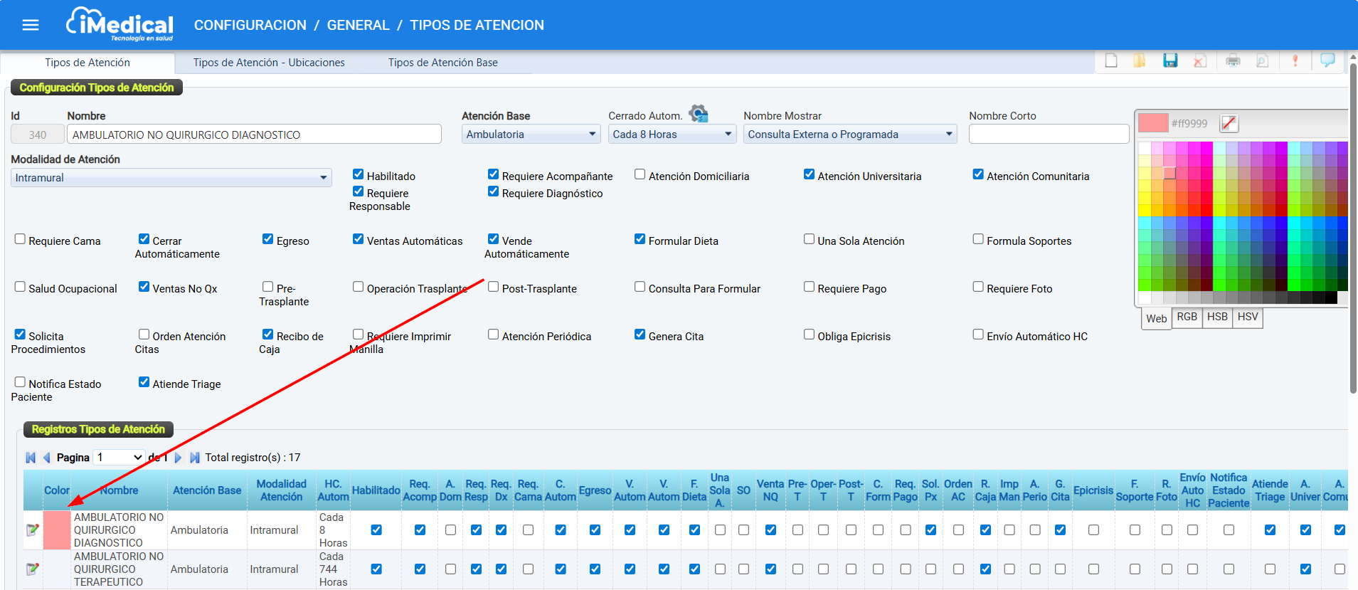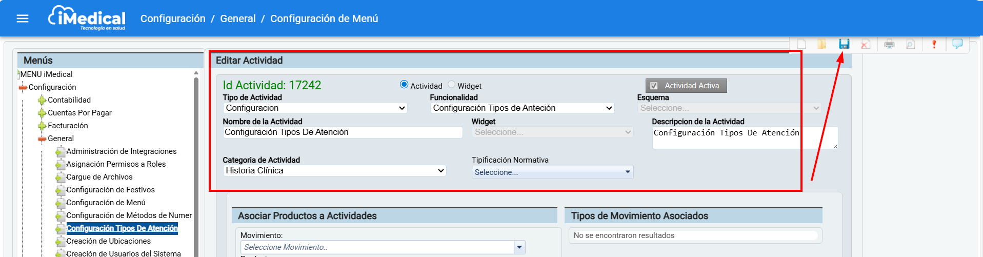 En el panel, verifique que la actividad Configuración tipos de atención este configurada de la siguiente manera: