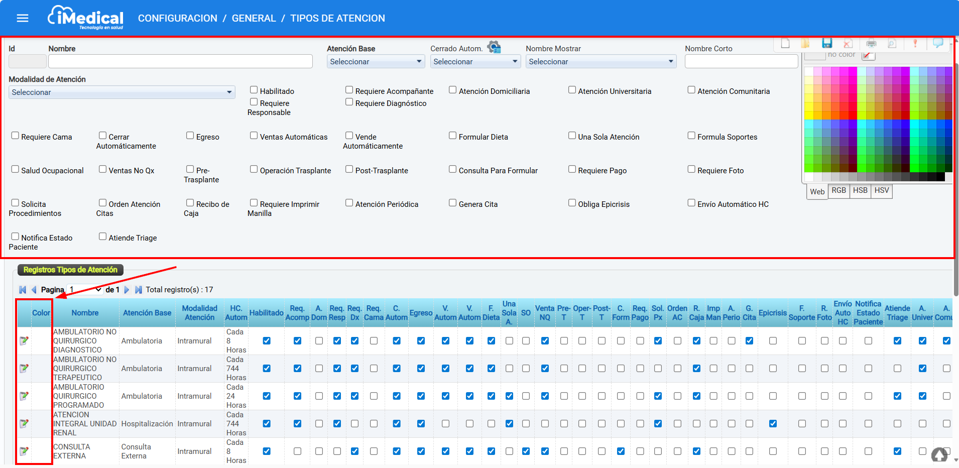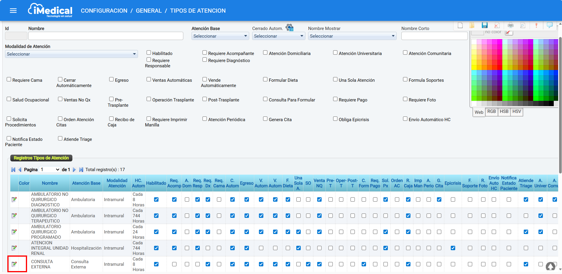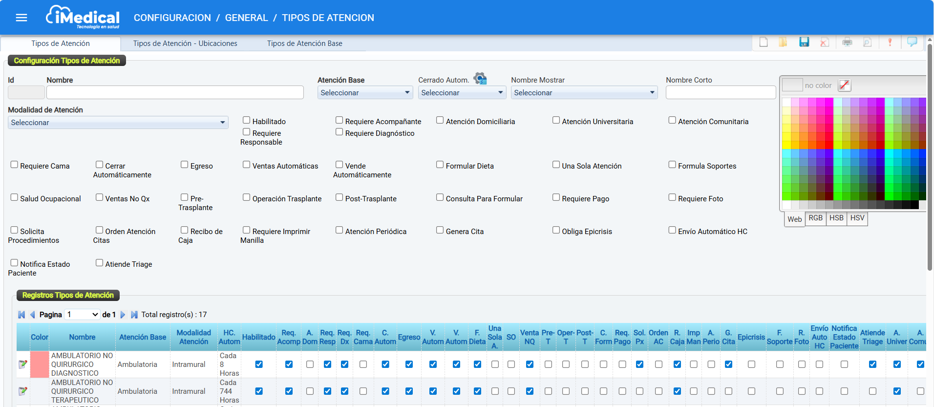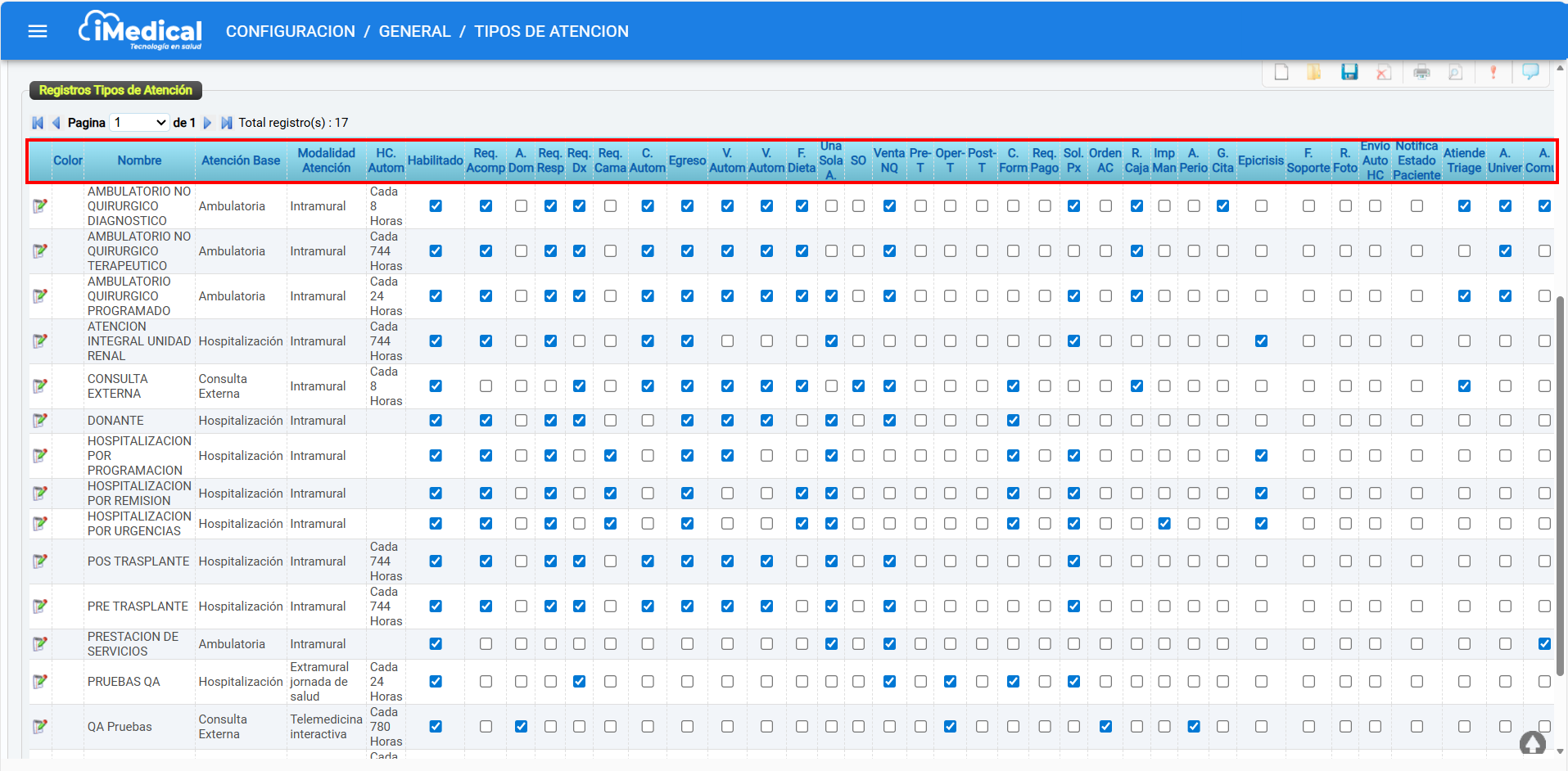 La sección Registros Tipos de Atención muestra el conjunto de tipos de atención configurados en el sistema iMedical. Desde este espacio es posible consultar, revisar o editar la información correspondiente a cada tipo de atención según su configuración y parámetros activos.