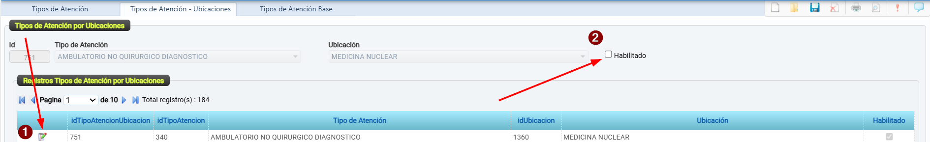 En caso de que una ubicación ya no está asociada a ningún tipo de atención, de clic en el icono Editar , desmarque la casilla "Habilitado"