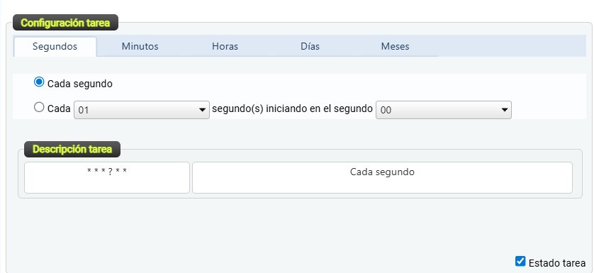 El campo Descripción tarea muestra de forma automática la expresión cron correspondiente, indicando la programación interna que seguirá el sistema.