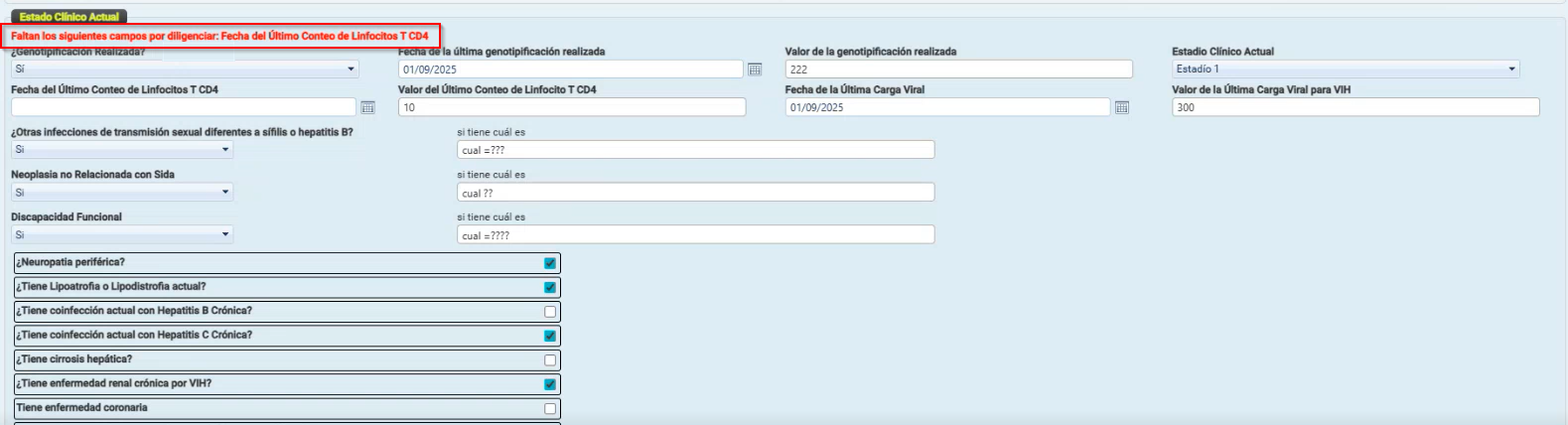 El paciente quedará registrado con diagnóstico principal de VIH y el formulario "Estado clínico actual" se habilitará para su diligenciamiento.