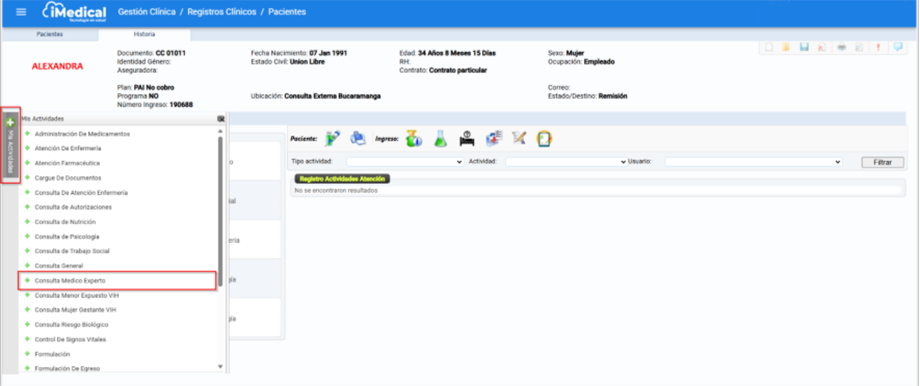 Ingrese a la sección "Mis actividades" y haga clic en la opción "Consulta Médico Experto". Con esto accederá al formulario correspondiente a este tipo de consulta.