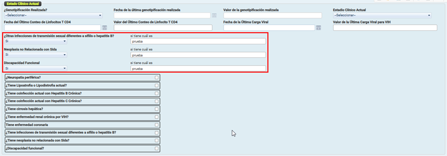Se puede elegir entre las opciones Sí, No o No aplica. En caso de marcar Sí, el sistema habilitará un campo adicional para que se especifique cuál es la infección.
