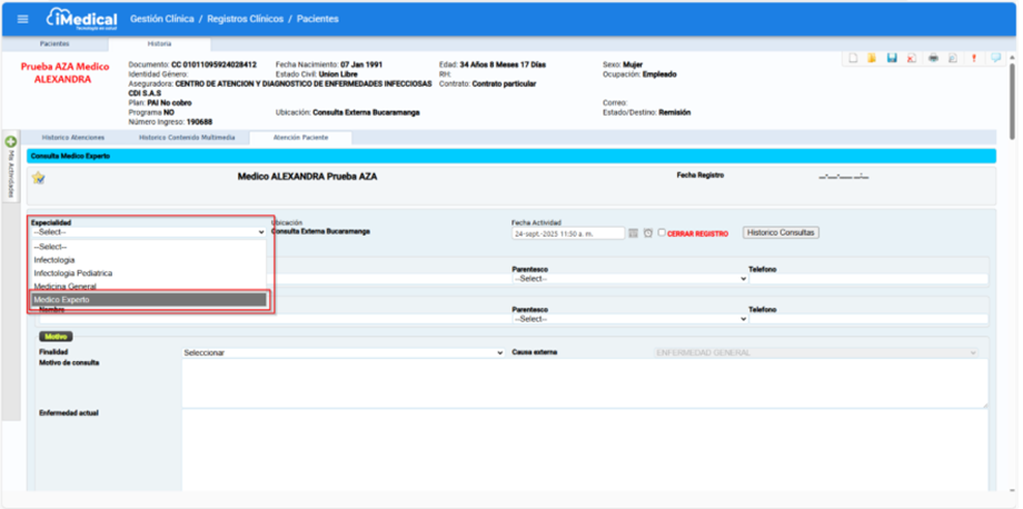 Dentro del formulario, ubique el campo Especialización. En este campo se despliega una lista de opciones, donde es obligatorio seleccionar la especialidad "Médico Experto". Esta elección asegura que la atención quede registrada en la categoría correcta y se refleje adecuadamente en los reportes clínicos.