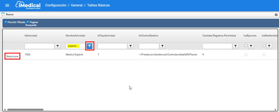 En la opción "NombreActividad" digite la palabra "experto" y de clic sobre el icono de filtrar , al aparecer el resultado dar clic sobre la palabra "Seleccione"