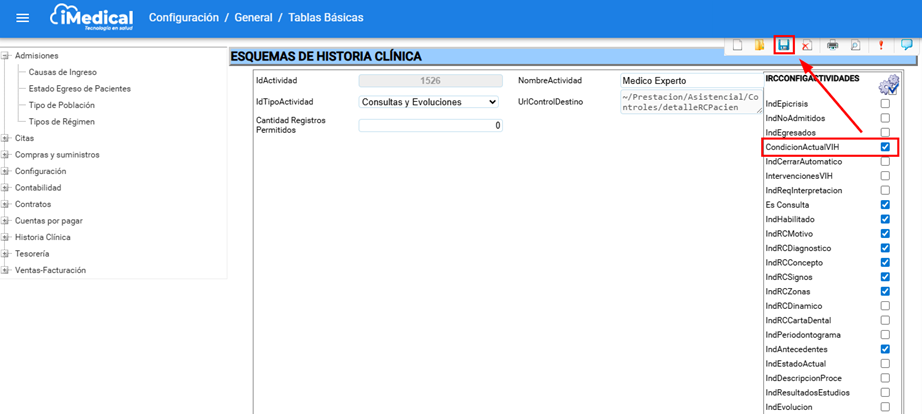 Como resultado del proceso anterior nos aparece un listado. Dentro de los ítems listados, se debe ubicar el que corresponda al formulario o condición que se necesita habilitar. En este caso es la que aparece como "CondiciónActualVIH", Selecciónela activando la casilla de verificación y luego de clic en el ícono de guardar para almacenar los cambios realizados en la configuración y asegurar que la esta quede registrada en el sistema.