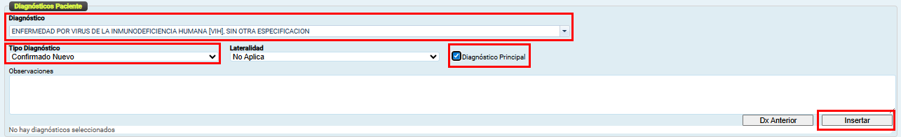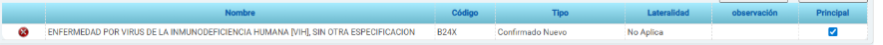 Active la casilla de verificación "Diagnóstico Principal", asegurándose de que esté marcado, para establecer que este diagnóstico corresponde a la condición principal dentro de la atención.