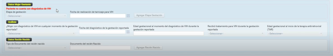 Además, para poder diligenciar los campos de Datos mujer gestante, el paciente debe contar con un diagnóstico de VIH registrado. Si no existe, el sistema mostrará el mensaje: