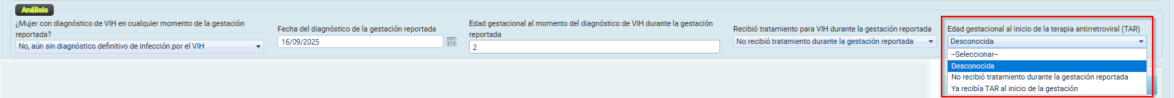 Campo Edad gestacional al inicio de la terapia antirretroviral (TAR).