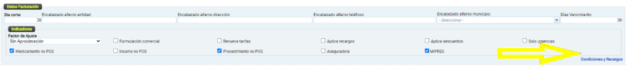 Para esta configuración ya se debe tener un contrato creado, se debe ingresar a la pestaña de Datos Generales en la sección "Datos Facturación", se debe dar clic a la palabra que está en azul en la parte inferior derecha Condiciones y Recargos.