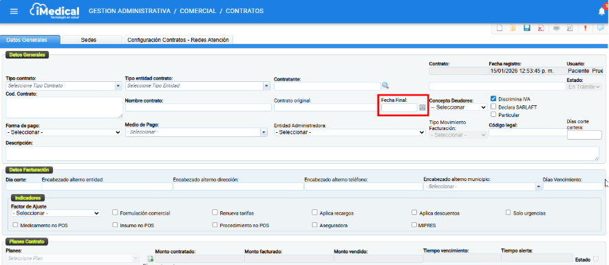 Este documento está dirigido a usuarios administrativos y de configuración del sistema de información iMedical, responsables de la gestión y control de contratos, así como del seguimiento a su vigencia durante los procesos de venta. El objetivo de este documento es describir las configuraciones necesarias para el uso adecuado de los contratos, permitiendo identificar de manera oportuna aquellos que se encuentren vencidos o próximos a vencer mediante una notificación emergente durante el proceso de venta.