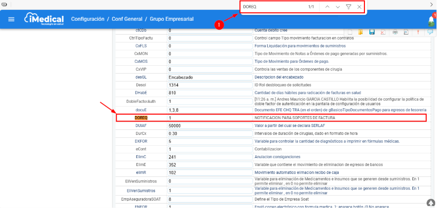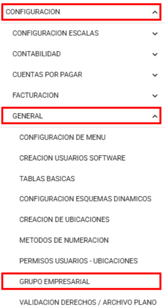 Para crear las variables o validar si ya están creadas, se debe proceder de la siguiente manera, siguiendo la Ruta: Configuración / General / Grupo empresarial.