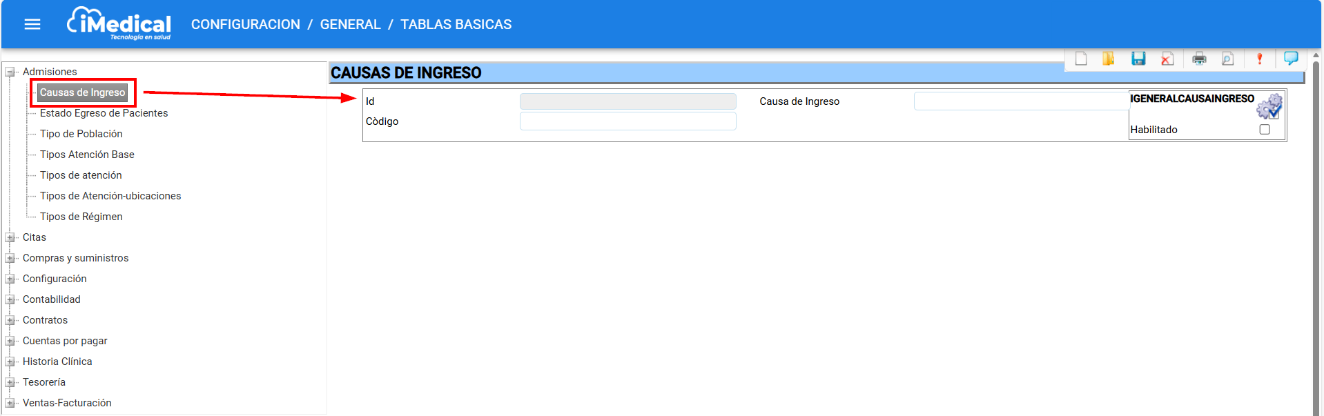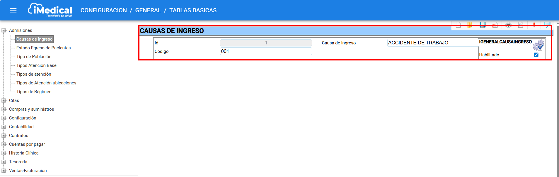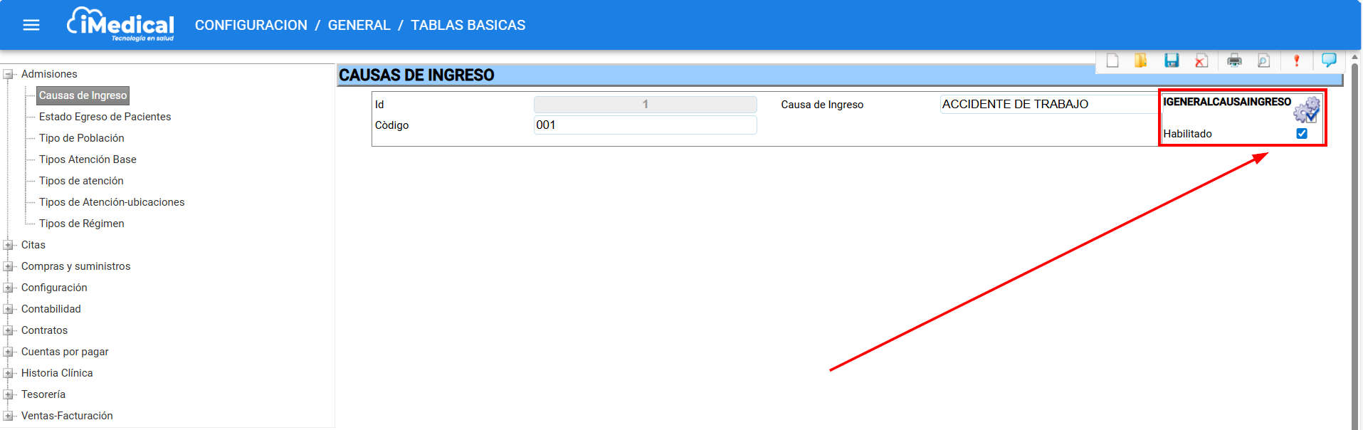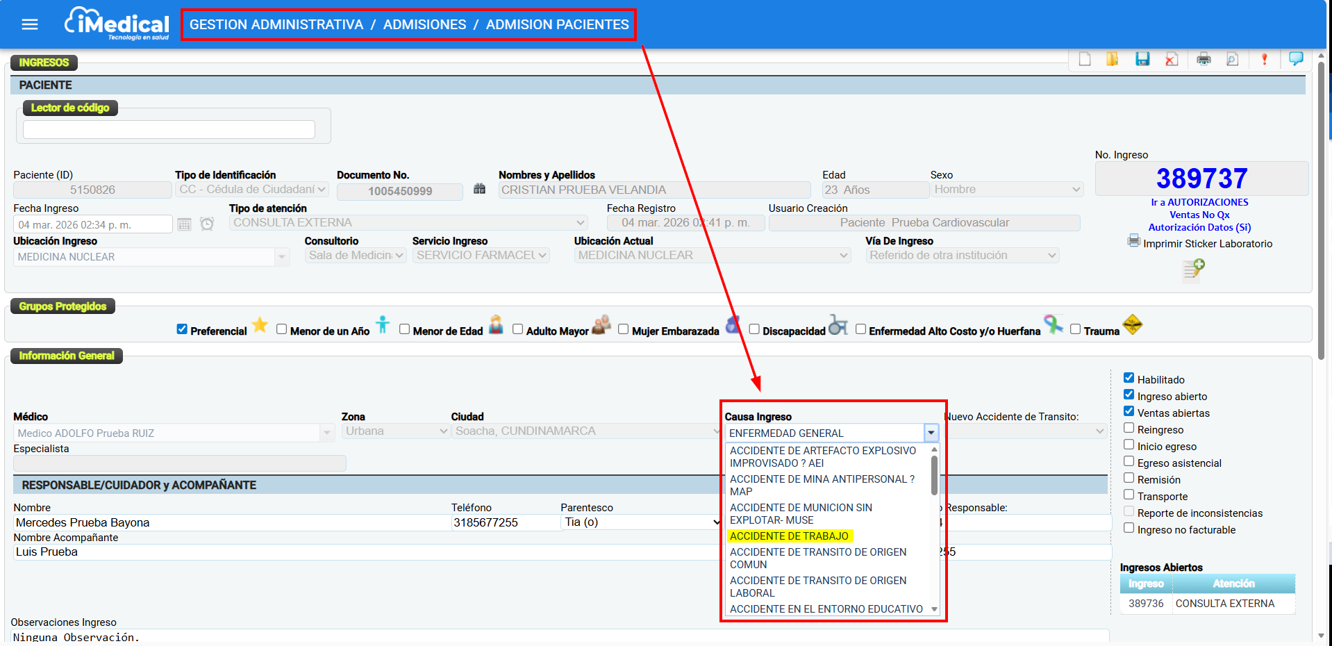 Al estar activo, esta opción se puede visualizar dentro de la pantalla de Admisión de pacientes (Modulo), en el campo Causa Ingreso (Funcionalidad).