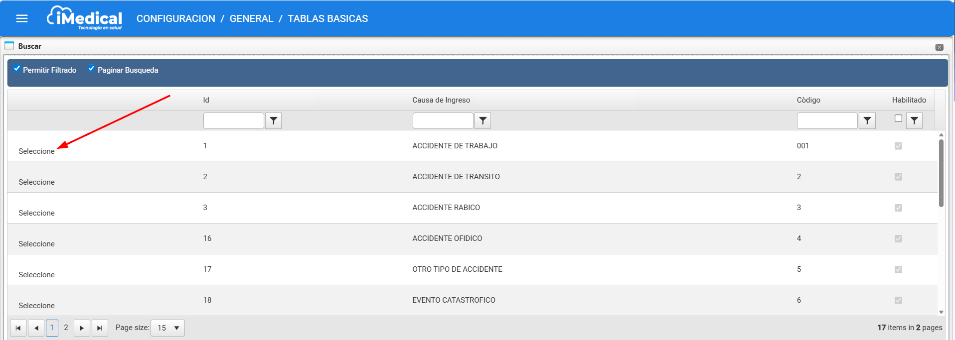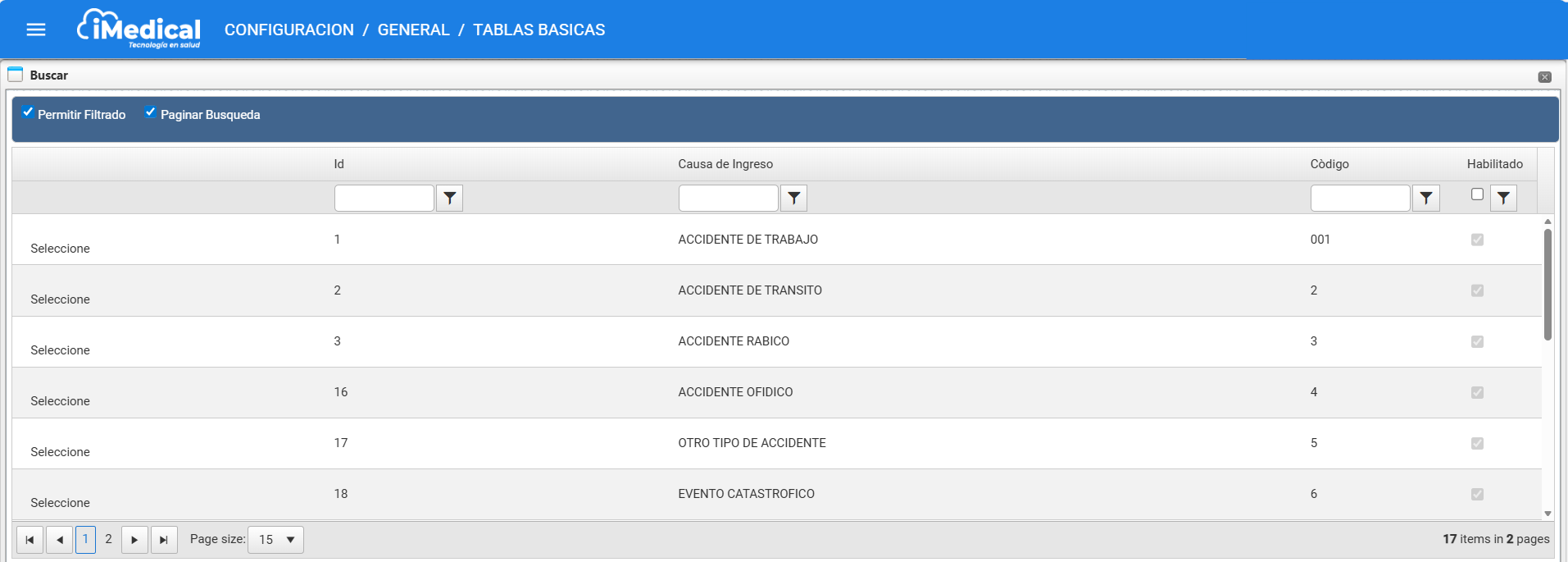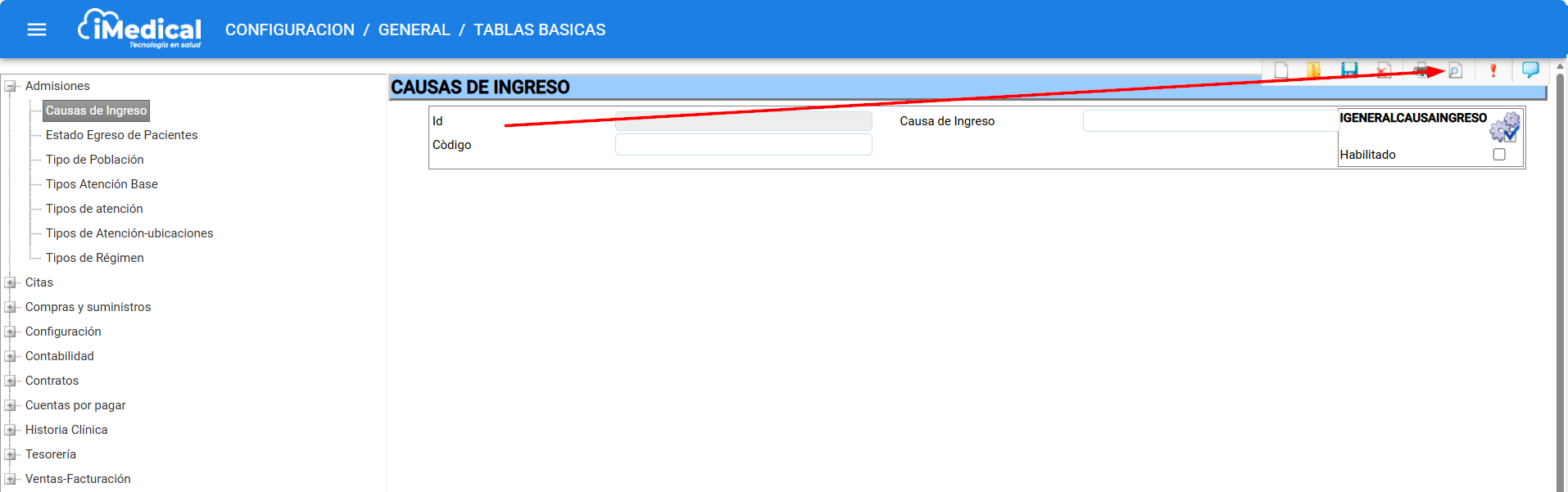 Al estar activo, esta opción se puede visualizar dentro de la pantalla de Admisión de pacientes (Modulo), en el campo Causa Ingreso (Funcionalidad).
