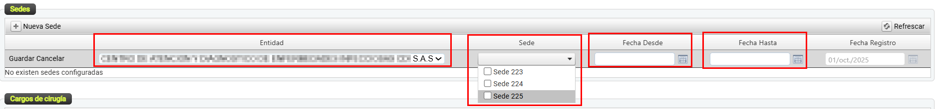 En este panel, se realiza el proceso de dar permisos sobre las sedes a las cuales el usuario tiene acceso, para realizar el proceso, de clic sobre "Nueva sede", y debe seleccionar la entidad, las sedes y las fechas.