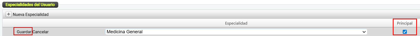 Una vez seleccionada la especialidad, de clic en la casilla de verificación "Principal" y en posteriormente en el botón "Guardar"