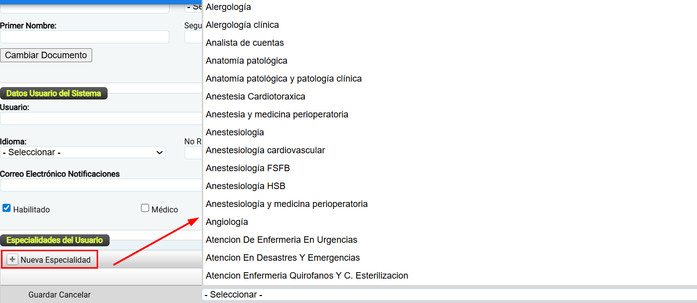 Nota. Los indicadores de "Médico" y "Persona Asistencial", siempre deben estar seleccionados para que sean mostrados en el proceso de agendamiento y en el proceso de creación de examen, cuando la entidad maneja el módulo de citas. De clic en "Nueva Especialidad" y seleccione la especialidad requerida en el campo desplegable de única selección.