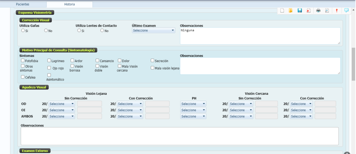 El presente manual tiene como objetivo orientar a los usuarios en la configuración y uso del Esquema de Visiometría dentro del sistema. Esta funcionalidad permite registrar, evaluar y controlar los diferentes parámetros relacionados con la evaluación visual del paciente como parte de la historia clínica.