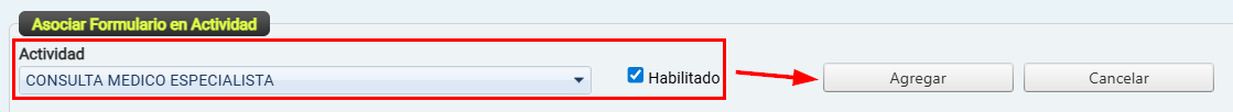 Una vez seleccionada la actividad, active la casilla de verificación "Habilitado" y después de clic en el botón "Agregar"
