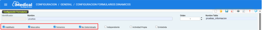 Active las casillas de verificación: "Habilitado, Masculino, Femenino y No Determinado"