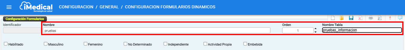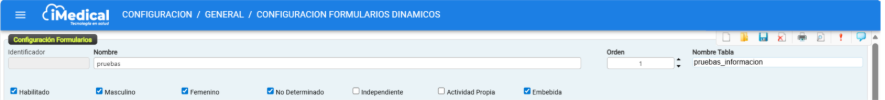 Para el proceso del formulario que va a estar dentro de las actividades de historia clínica, siempre debe estar activa la casilla de verificación "Embebida". Esto quiere decir que los documentos o formularios dinámicos van a quedar incluidos dentro de la consulta.