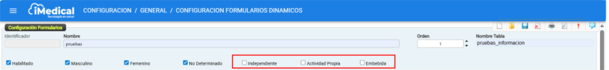 Las casillas de "Independiente" y "Actividad Propia", solamente se configuran para que dentro del módulo de Registros Clínicos se visualice únicamente la opción, pero es un formulario que no va a quedar asociado al paciente sino dentro de un proceso de registro de historia clínica que se requiera.