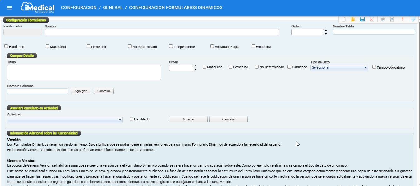 Este manual está dirigido a usuarios administrativos, personal de soporte y profesionales responsables de la configuración clínica dentro del sistema iMedical. En particular, está orientado a quienes realizan la parametrización de los formularios dinámicos utilizados en la historia clínica, asegurando que su estructura, campos y asociaciones funcionen correctamente dentro de los procesos asistenciales.