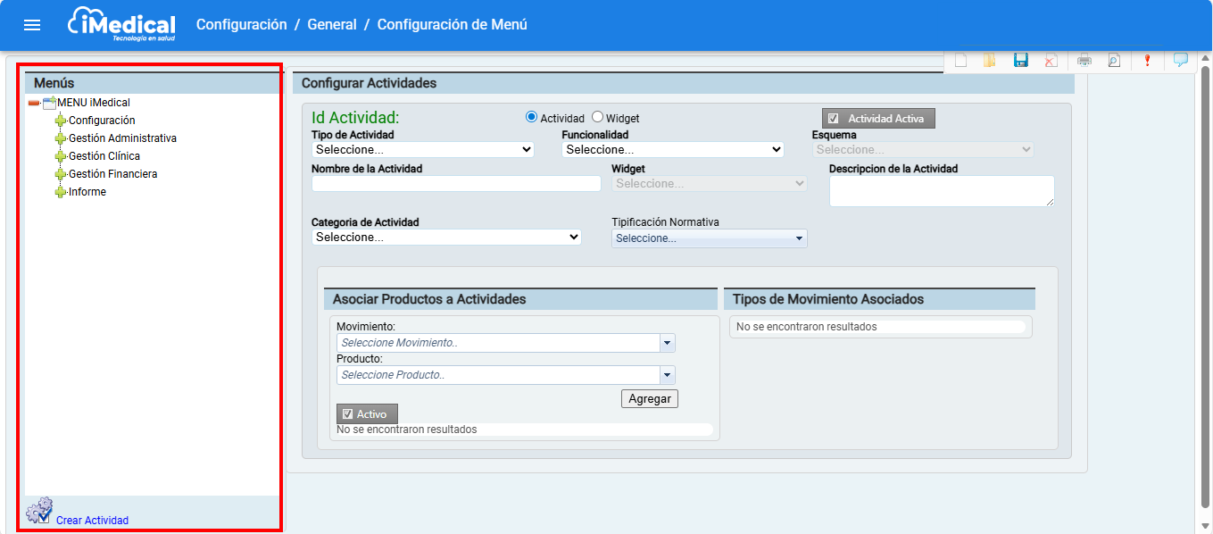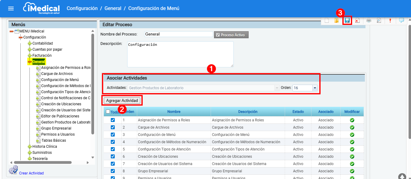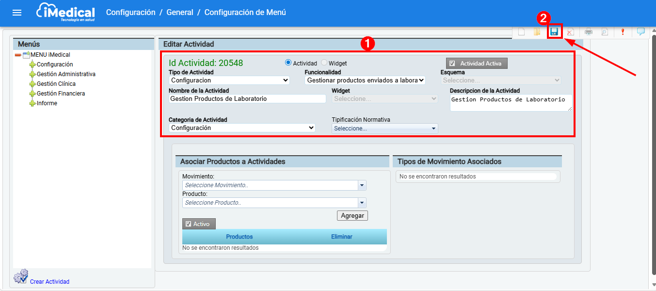 Posteriormente asocie la actividad a la opción correspondiente dentro del menú y una vez asociada la actividad, de clic en icono "Guardar"