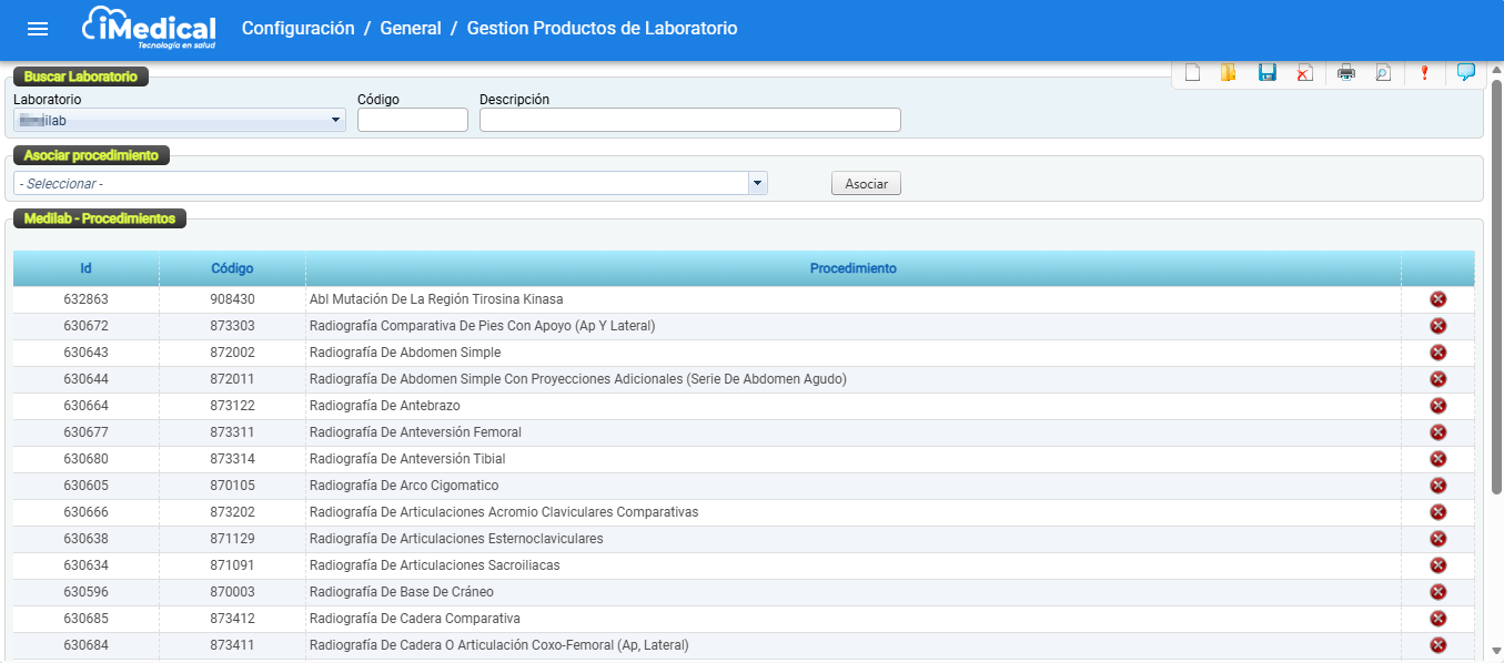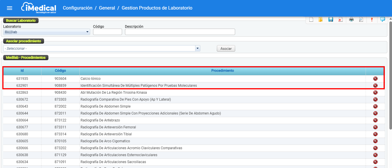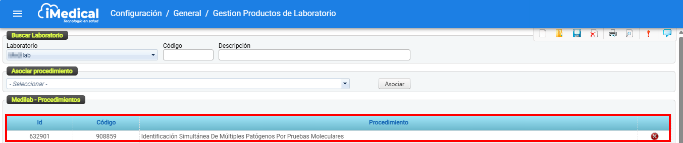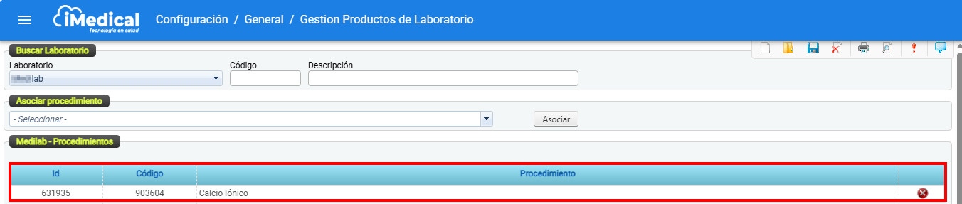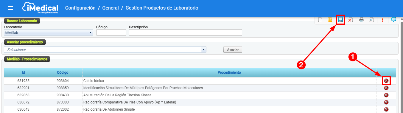 En la tabla que muestra los procedimientos asociados al laboratorio, busque el ítem que desea desasociar haciendo clic en el icono "Eliminar"